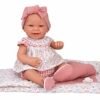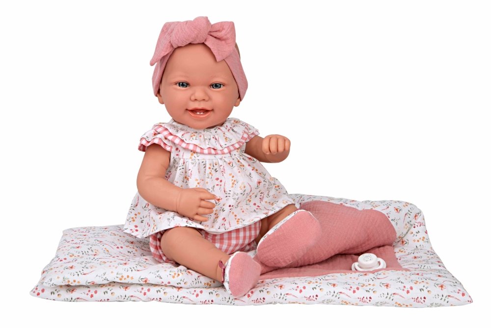 - Lėlytė aprengta rožiniais, gėlėtais rūbeliais, turi galvajuostę, medžiaginius batelius. Rinkinį papildo derantis pledukas.