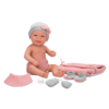 - Lėlytė aprengta su kelnaitėmis, kepurėle, kojinytėmis, pirštinytėmis ir kepuryte. Turi seilinuką. Rinkinį papildo specialus pledukas.