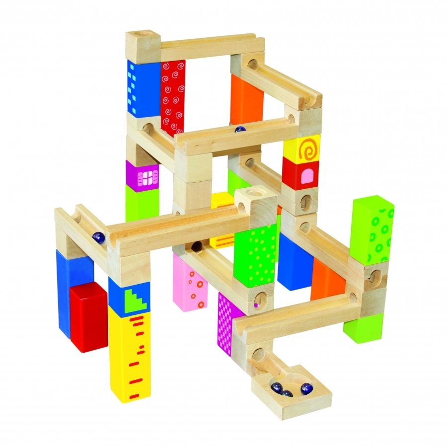 - Rinkinį sudaro 66 medinės detalės (kaladėlės) ir 18 stikliniai kamuoliukai.